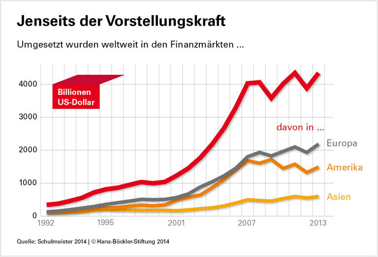 Finanzmarktumsätze erreichen Größenordnungen, mit denen sich der Alltagsverstand schwer tut: tausende Billionen Dollar. Zur Grafik