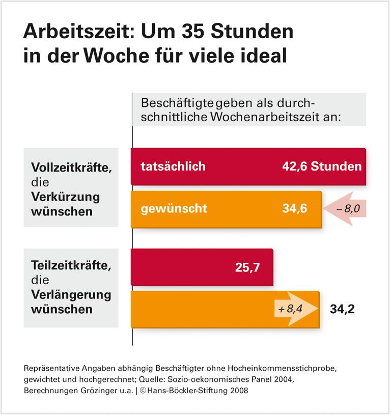 Große Abweichungen zur Wunscharbeitszeit. Die gewünschte Arbeitszeit der Erwerbstätigen liegt im Schnitt bei rund 34,5 Stunden je Woche. Das gilt für den Durchschnitt aller Untergruppen: für die mit dem Status Quo Zufriedenen ebenso wie für die Unzufriedenen. Und es gilt sowohl für jene, die ihre Arbeitszeit verkürzen möchten wie auch für jene, die sie gerne etwas länger hätten. Die Zeitpräferenzen sind "fast deckungsgleich", stellen die Autoren fest. Auf die weit verbreiteten und eindeutigen Vorlieben nimmt die Praxis mit vollen und halben Stellen jedoch wenig Rücksicht.