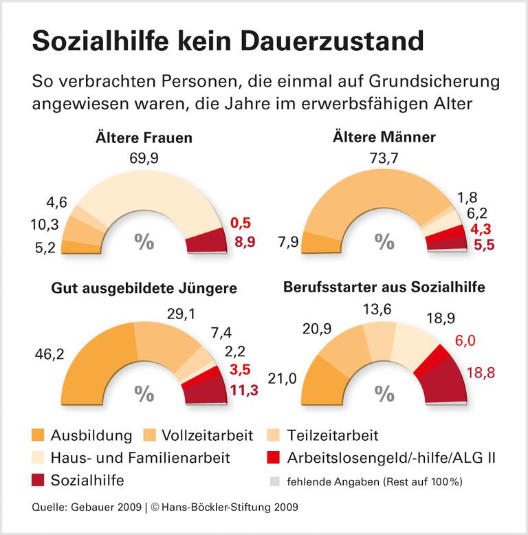 Gut ausgebildete Jüngere: Häufiger Wechsel zwischen Sozialhilfe, Arbeit und Ausbildung. Bei den Jüngeren, ab dem Geburtsjahr 1960, haben sich Biografien von Frauen und Männern angeglichen. Die Ausbildung dauerte länger, Teilzeitarbeit ist weiter verbreitet als bei den Älteren. Ausbildung, Berufstätigkeit und Sozialleistungsbezug wechseln sich oft ab oder überlappen sich. Das häufige Hin und Her lasse gerade "in den mittleren und späteren Lebensabschnitten auf ein hohes Aktivitätspotenzial schließen, das sich in dem Bemühen ausdrückt, nach Arbeitsverlust erneut auf dem Arbeitsmarkt Fuß zu fassen", so die Studie. Eine Teilgruppe fällt durch besonders lange Ausbildungszeiten auf - oft über das 25. Lebensjahr hinaus. Vollzeittätigkeiten spielen eine geringere Rolle als bei anderen Gruppen, Sozialhilfe in Kombination mit anderen Tätigkeiten kommt gerade in der Lebensmitte relativ häufig vor.