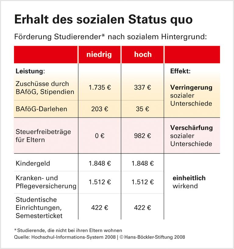 Außerdem unterstützt der Staat auch die Eltern der Studierenden, indem er ihnen länger Kindergeld zahlt und Steuererleichterungen wie den Ausbildungsfreibetrag gewährt. Beides kommt vor allem einkommensstarken Familien zu Gute.