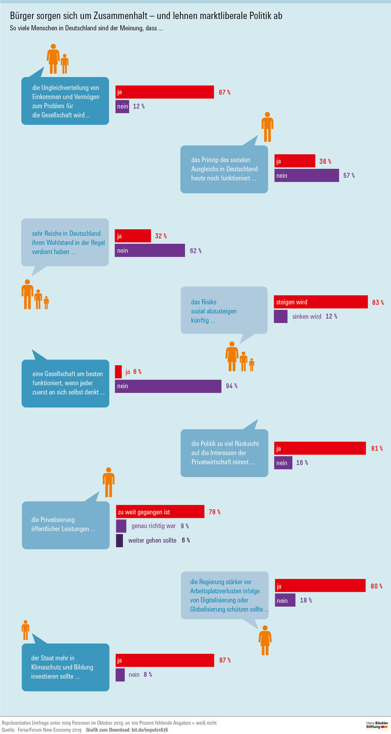 Wie aus der Umfrage hervorgeht, teilen viele Menschen die Einschätzung, dass die bisherige wirtschaftspolitische Ausrichtung zu Fehlentwicklungen führt: 87 Prozent der Befragten halten das wachsende Gefälle zwischen Arm und Reich für gefährlich. Offenbar schätzen die meisten steigende Ungleichheit nicht als wirtschaftlich nachvollziehbar ein: Nur ein Drittel sagt, dass jemand, der in Deutschland sehr reich ist, diesen Reichtum „in aller Regel auch verdient“. Ebenfalls gut ein Drittel der Befragten ist der Meinung, dass das Prinzip des sozialen Ausgleichs in Deutschland heute noch funktioniert.