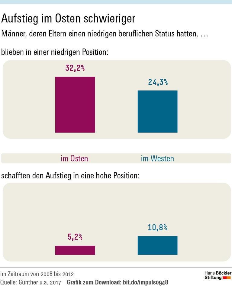 Gleichwohl ergeben sich große Unterschiede zwischen Ost und West – heute sogar noch größere als kurz nach der Wende. Besonders bei Männern zeigt sich, dass die beruflichen Perspektiven und Karrierechancen in den alten und neuen Bundesländern sehr ungleich verteilt sind. Aktuell bleiben etwa 32 Prozent der ostdeutschen Männer, deren Eltern einen niedrigen beruflichen Status hatten, in einer niedrigen Position. Bei den westdeutschen Männern sind es 24 Prozent.