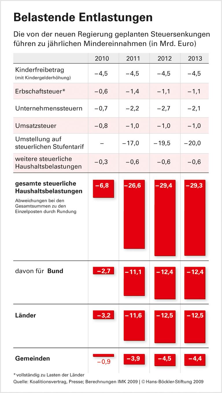 Bereits im kommenden Jahr wird der Staat insgesamt rund 21 Milliarden Euro weniger einnehmen. Noch von der großen Koalition wurden Steuer- und Abgabensenkungen um 14 Milliarden Euro beschlossen. Die neue Koalition aus Union und FDP hat zusätzlich Änderungen bei der Unternehmensbesteuerung, der Umsatzsteuer und der Erbschaftsteuer sowie eine Anhebung des Kinderfreibetrags und des Kindergeldes vereinbart. Anschließend sieht der Koalitionsvertrag bei der Lohn- und Einkommensteuer den Einstieg in einen Stufentarif vor, der in den Jahren 2011 bis 2013 zu Steuerausfällen von noch einmal jährlich rund 19 Milliarden Euro führt.