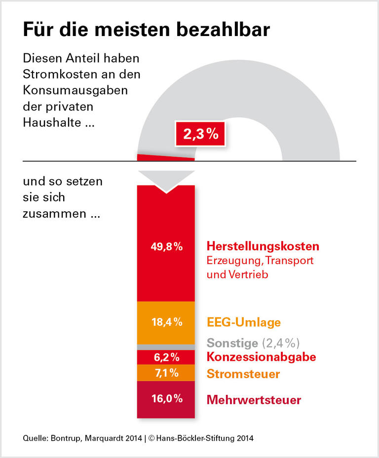 Es sei erstaunlich, wie die Kostenbelastung durch die Energiewende zuweilen dramatisiert werde, schreiben Heinz-Josef Bontrup und Ralf-Michael Marquardt in einer neuen Studie. Schließlich entfallen nur gut zwei Prozent der Konsumausgaben privater Haushalte auf Strom. Und der gesamte Warenkorb eines Drei-Personen-Haushalts hat sich durch die Energiewende um maximal drei Prozent verteuert, wie die Professoren an der Westfälischen Hochschule und Mitglieder des Westfälischen Energieinstituts ausgerechnet haben. Darin enthalten sind zum einen die direkten Mehrkosten des Stroms – plus 47 Prozent im Vergleich zu einem Szenario ohne Umlage nach dem Erneuerbare-Energien-Gesetz (EEG) und andere ökologisch motivierte Preisaufschläge. Zum anderen haben die Wissenschaftler mit einem komplexen Modell ermittelt, inwieweit gestiegene Stromkosten zu höheren Preisen bei anderen Gütern führen. Auch dies ist eingerechnet.