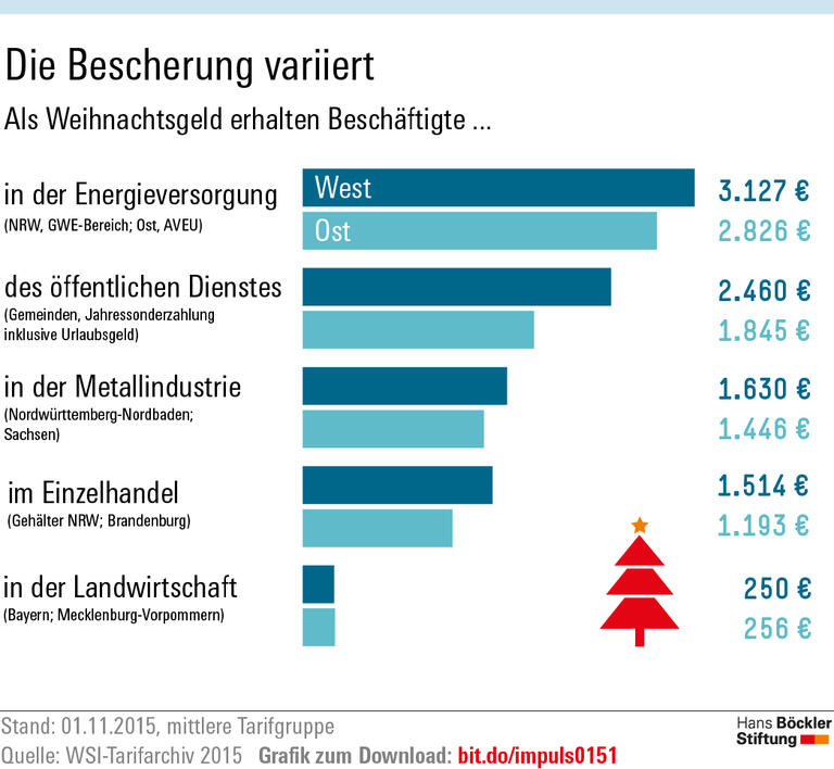 Grundsätzlich sehen laut der Auswertung die geltenden Tarifverträge in den meisten Branchen ein Weihnachtsgeld vor. Es wird überwiegend als fester Prozentsatz vom Monatseinkommen berechnet. Die entsprechenden tariflichen Vereinbarungen haben sich im Vergleich zu den Vorjahren kaum verändert. Dort, wo die Tarifabschlüsse höher ausgefallen sind, steigen auch die tariflichen Weihnachtsgelder stärker. Die Spanne reicht von 1,0 Prozent in der Druckindustrie bis zu 5,1 Prozent in der Papier verarbeitenden Industrie. Im Bankgewerbe beträgt der Zuwachs 2,1 Prozent, im Versicherungsgewerbe 2,4 Prozent, in der chemischen Industrie West 2,8 Prozent, in der Metallindustrie 3,4 Prozent und bei der Deutschen Bahn 3,6 Prozent.Ein vergleichsweise hohes Extra erhalten unter anderem die Beschäftigten im Bankgewerbe sowie in der Süßwaren-, der Chemie-, der Druck- und der westfälischen Textilindustrie mit 95 bis 100 Prozent eines Monatseinkommens. Es folgen unter anderem die Versicherungen mit 80 Prozent, der westdeutsche Einzelhandel mit vorwiegend 62,5 Prozent sowie die Metallindustrie mit überwiegend 55 Prozent. Die westdeutschen Gemeinden zahlen je nach Vergütungsgruppe zwischen 60 und 90 Prozent. Kein Weihnachtsgeld erhalten unter anderem die Beschäftigten im Bauhauptgewerbe Ost und im Gebäudereinigerhandwerk.