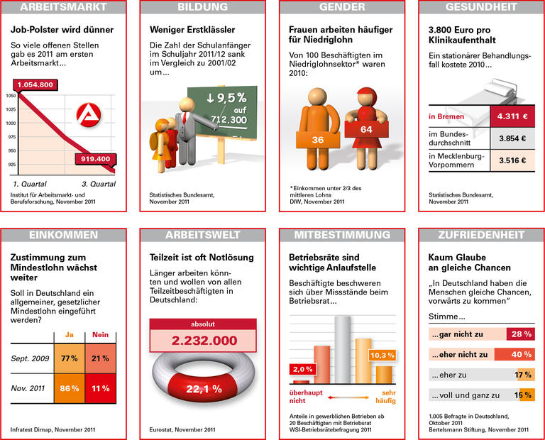 3,6 Millionen Beschäftigte in Deutschland arbeiten für weniger als sieben Euro in der Stunde – Rentner-, Schüler- und andere Nebenjobs nicht mitgerechnet. Das geht aus einer Auswertung des Institut Arbeit und Qualifikation (IAQ) für das Jahr 2009 hervor. Mehr als 1,2 Millionen Erwerbstätige bekamen demnach sogar weniger als fünf Euro. Von der Einführung eines Mindestlohns in Höhe von 8,50 Euro würden der Studie zufolge fast 5,8 Millionen Menschen profitieren – dies entspreche fast einem Fünftel aller Beschäftigten.