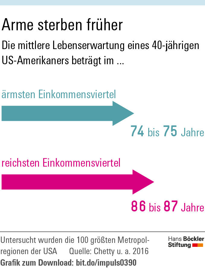 - Der Unterschied in der Lebenserwartung zwischen dem ärmsten und dem reichsten Prozent der Einkommensverteilung lag im Untersuchungszeitraum bei fast 15 Jahren für Männer und 10 Jahren für Frauen. Während die reichen Männer im Schnitt 87,3 Jahre alt wurden, lebten die armen 72,7 Jahre. Die wohlhabenden Frauen brachten es auf 88,9 Jahre, die einkommensschwachen Frauen starben im Schnitt nach 78,8 Jahren.