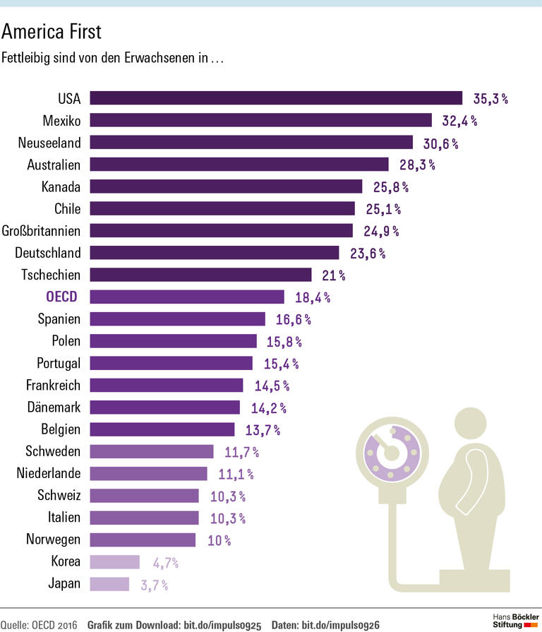 Deutschland gewinnt an Gewicht: Laut OECD ist der Anteil der adipösen Erwachsenen allein zwischen 2000 und 2013 von 20,3 auf 23,6 Prozent gestiegen. Noch dramatischer ist die Situation in den USA, wo zuletzt mehr als ein Drittel der Bevölkerung betroffen war. Ökonomen um Trenton Smith von der neuseeländischen Universität Otago haben dafür eine Erklärung parat: Sie machen mangelnde wirtschaftliche Sicherheit für die Adipositas-Epidemie verantwortlich.