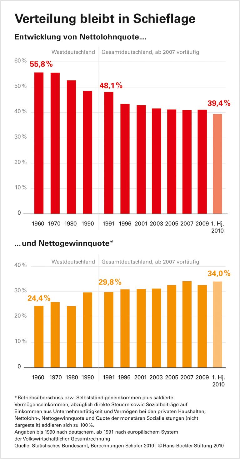 Der Anteil der Gewinn- und Kapitaleinkommen am Volkseinkommen ist im ersten Halbjahr 2010 wieder deutlich gestiegen, die Lohnquote ging zurück.