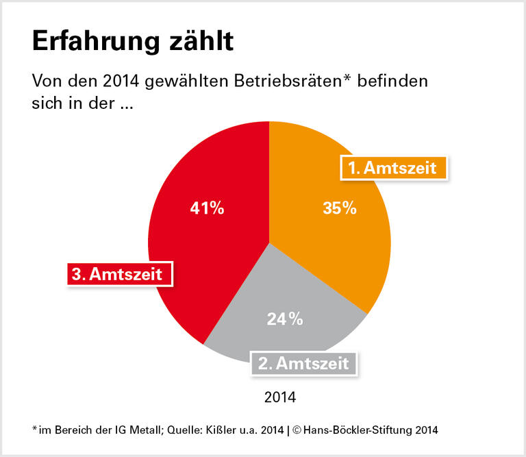 Viel Erfahrung: Eine Mehrheit der 2014 gewählten Betriebsräte hat der Auswertung zufolge mindestens eine Amtszeit hinter sich, im Bereich der IG Metall beispielsweise rund zwei Drittel. Diese personelle Kontinuität spreche für den Professionalisierungsgrad der betrieblichen Mitbestimmungsarbeit, konstatieren die Soziologen. Die Routine der länger amtierenden Betriebsratsmitglieder führe in Verbindung mit ihrer anerkannten Vertretungspolitik augenscheinlich dazu, dass sie mehrfach wiedergewählt werden. Die „Verberuflichung der Betriebsratsarbeit“ habe allerdings auch einen Nachteil: Die Gremien befänden sich in einem Zyklus der Alterung. Um den professionellen Standard nach dem absehbaren Ausscheiden älterer und bewährter Mitglieder nachhaltig zu gewährleisten, gelte es daher, noch mehr junge Beschäftigte für die Betriebsratsarbeit zu gewinnen.