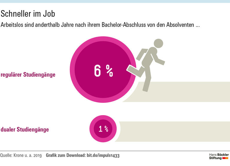 Tatsächlich sind zwei Drittel der Befragten nach dem dualen Studium ihrem Ausbildungsbetrieb treu geblieben. Die übrigen Absolventen sind größtenteils bei anderen Betrieben untergekommen, ein Viertel von ihnen hat ein Masterstudium aufgenommen, nur drei Prozent waren zum Zeitpunkt der Befragung arbeitslos. Akademiker mit dualen Abschlüssen stehen damit deutlich besser da als diejenigen mit „normalem“ Bachelor, bei denen die Arbeitslosenquote anderthalb Jahre nach dem Studium sechs Prozent beträgt. Das gilt auch in anderer Hinsicht: In Vollzeit arbeiten 93 Prozent der Absolventen dualer Studiengänge, beim regulären Bachelor sind es 80 Prozent. Eine unbefristete Stelle ergattern nach dem dualen Studium drei Viertel der Berufseinsteiger, nach dem regulären Fachhochschulstudium die Hälfte, nach der Uni ein Drittel.