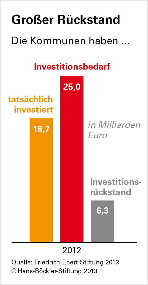 Auch wenn die Zahlen sich ein wenig unterscheiden – die Stoßrichtung ist dieselbe: Deutschlands Kommunen leiden unter einem enormen Investitionsrückstand. So beziffert das Deutsche Institut für Urbanistik (DIFU) den kommunalen Investitionsbedarf zwischen 2006 und 2020 auf 47 Milliarden Euro jährlich. Das Deutsche Institut für Wirtschaftsforschung sieht eine besonders große Baustelle bei der gesamten kommunalen Infrastruktur, also Straßen und dem öffentlichen Personennahverkehr. Und die Kommunen selbst schätzen ihren Investitionsrückstand auf 128 Milliarden Euro bis zum Jahr 2012 – davon 26 Prozent bei der Verkehrsinfrastruktur und 17 Prozent bei den Schulen.