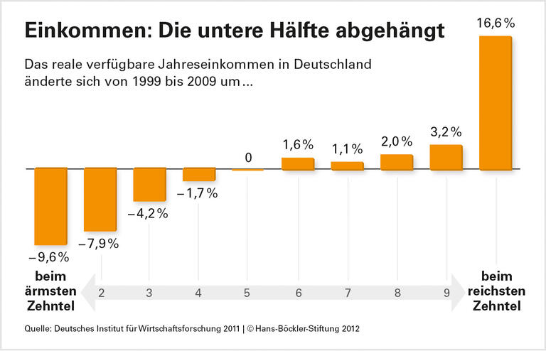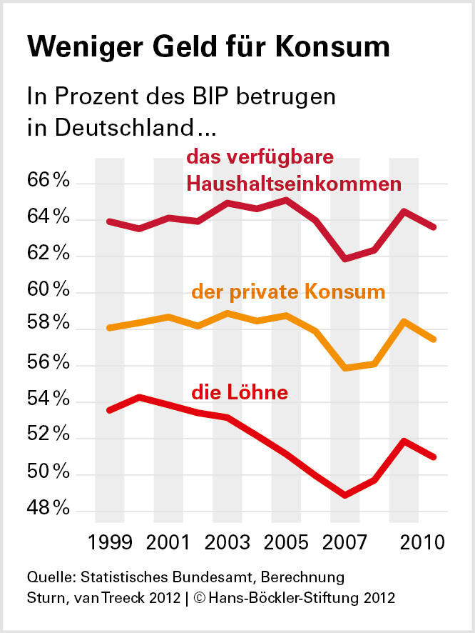 Seit der Jahrtausendwende sind die Löhne deutscher Arbeitnehmer kaum gestiegen, die Schere zwischen großen und kleinen Einkommen hat sich immer weiter geöffnet. Zwischen 2001 und 2007 sank die Lohnquote gemessen am Bruttoinlandsprodukt um mehr als fünf Prozentpunkte. In den Jahren 1999 bis 2009 wuchs das verfügbare Einkommen des reichsten Zehntels um 16,6 Prozent, das des ärmsten Zehntels schrumpfte um 9,6 Prozent. Dabei war Deutschland laut Daten der Bundesbank bereits zum Start der Währungsunion 1999 in hohem Maße wettbewerbsfähig, so die Forscher. Aufgrund der im europäischen Vergleich weit unterdurchschnittlichen Lohnentwicklung konnte die deutsche Wirtschaft diesen Vorteil immer weiter ausbauen. Hingegen dämpften die schwache Reallohnentwicklung und die zunehmende Einkommensungleichheit die Binnennachfrage.
