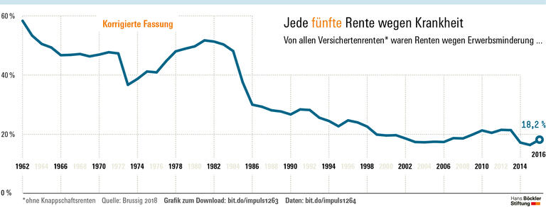Mitte der 1960er-Jahre war noch mehr als jede zweite neu bewilligte Rente eine Erwerbsminderungsrente. Ihr Anteil ist bis 2006 auf 17,4 Prozent gefallen. Seitdem ist ihr Anteil wieder leicht gestiegen; aktuell ist jede fünfte bewilligte Rente eine Erwerbsminderungsrente. Dies sei auch eine Folge der Anhebung der Altersgrenzen, denn „dadurch wird aufgedeckt, dass viele nicht bis zum Erreichen einer regulären Altersgrenze arbeiten können“, schreiben die Forscher.