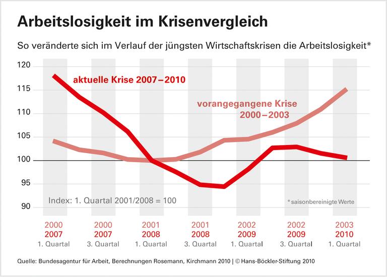 Während die Zahl der Jobs im exportorientierten Verarbeitenden Gewerbe sank, erholte sich die Beschäftigung bei Banken und Versicherungen nach einem anfänglichen Rückgang relativ schnell. Und in weiten Teilen des Dienstleistungsbereichs war - wie schon in der Rezession der Jahrtausendwende - vom Konjunktureinbruch wenig zu spüren: Die Zahl der Arbeitsplätze nahm auch während der Krise zu. Restaurants, Hotels, Schulen, Kinderkrippen, Sozial und Gesundheitseinrichtungen stellten trotz Wirtschaftsflaute ein.