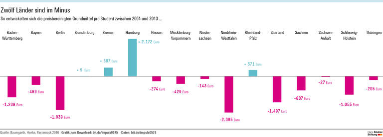 Die größte Bedeutung für die Finanzierung des Hochschulsystems haben die laufenden Grundmittel. Sie beliefen sich im Jahr 2013 auf 18,3 Milliarden Euro – und sind damit seit 2004 bundesweit betrachtet um 29 Prozent gestiegen. Die laufenden Grundmittel, mit denen Hochschulen zum Beispiel Personal, Verwaltung oder Gebäude bezahlen, werden zum allergrößten Teil von den Ländern bereitgestellt. Die Zuwächse bei der Grundfinanzierung schwanken stark nach Bundesländern: Am größten waren sie in Hamburg (+85 Prozent), Baden-Württemberg (+51 Prozent) und Hessen (+50 Prozent), am geringsten in Sachsen (+6 Prozent), Thüringen (+18 Prozent) und Bremen (+19 Prozent). Das einzige Bundesland, das weniger für seine Hochschulen ausgab, war Berlin mit einem Minus von 9 Prozent.