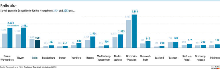 Hochschulen in Deutschland sind weiterhin unterfinanziert. Zwar stehen heute deutlich mehr Mittel als noch vor zehn Jahren zur Verfügung, aber gemessen an der steigenden Zahl der Studierenden immer noch zu wenig. Das ist das Ergebnis einer Studie von Benjamin Baumgarth, Justus Henke und Peer Pasternack vom Institut für Hochschulforschung (HoF) Halle-Wittenberg im Auftrag der Hans-Böckler-Stiftung. Die Forscher haben die Finanzierung des gesamten Hochschulsystems untersucht. Neben der Grundfinanzierung der Hochschulen zählen dazu unter anderem Ausgaben für Investitionen oder Studienförderung sowie Drittmittel. Ausgenommen sind Universitätskliniken.