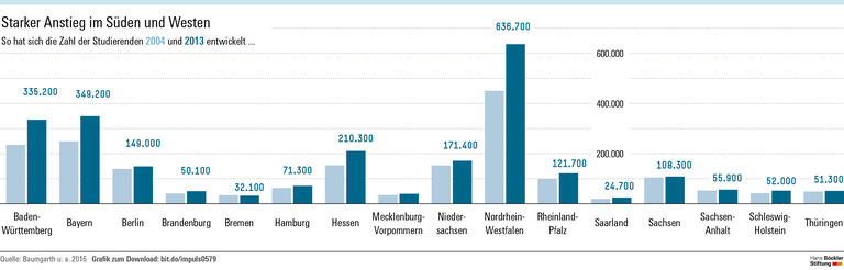 Die Zahl der Studierenden nimmt zu. Die Finanzierung der Hochschulen hält damit nicht Schritt. Vor allem Bayern, Baden-Württemberg, Hessen und NRW müssten mehr investieren.